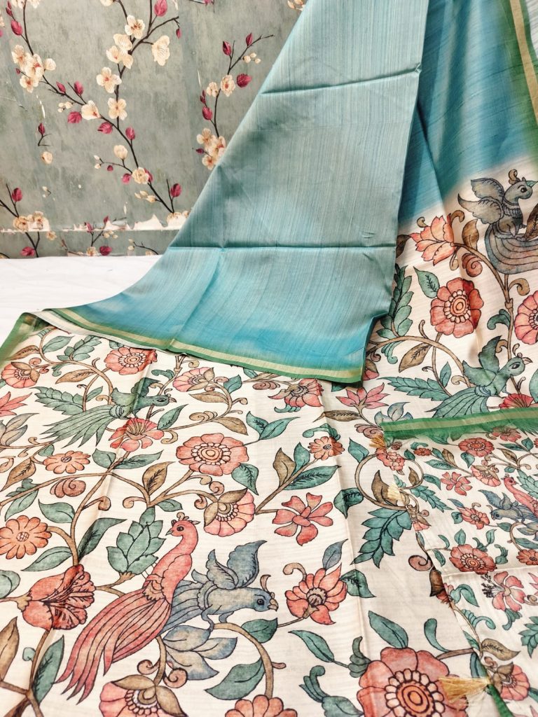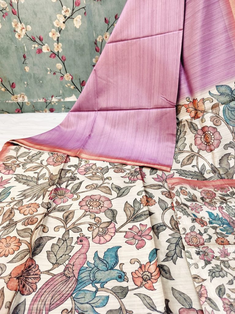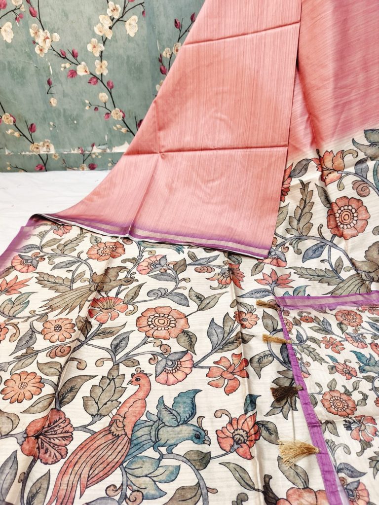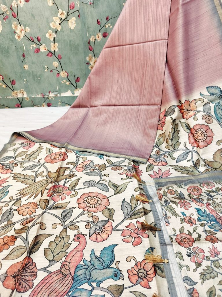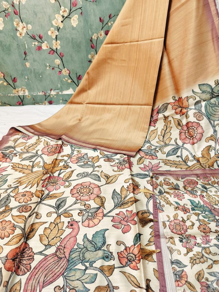 Exclusive premium tussar silk body in plain and kalamkari pallu design with attached kalamkari BP